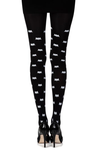 Zohara “Super Hero” tights feature an all-over grey bat print on opaque black 120-denier fabric. Bold, comic-inspired legwear made sustainably in Europe.