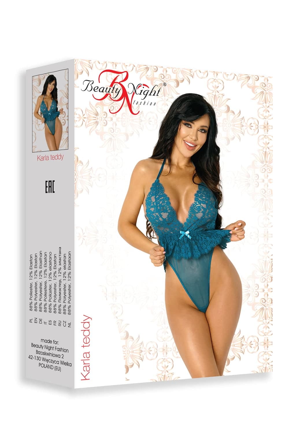 A seductive teddy that features delicate lace and soft transparent mesh combined to enhance your shape. Karla arrives packaged in a Beauty Night Gift Box. Beauty Night gift boxes are a gift in themselves! Made from premium materials, they are laser-spot printed with a front and back image of the garment, and carry the Beauty Night logo both as a raised image and a hologram. This is a mark of quality and authenticity. The box also carries sizing and fabric information These boxes are very pretty, and are also useful for storage. There is an organza bag to keep the garment in or use as a laundry bag. Within the outer sleeve, there is a lovely embossed presentation box with the Beauty Night logo in beautiful gloss white.