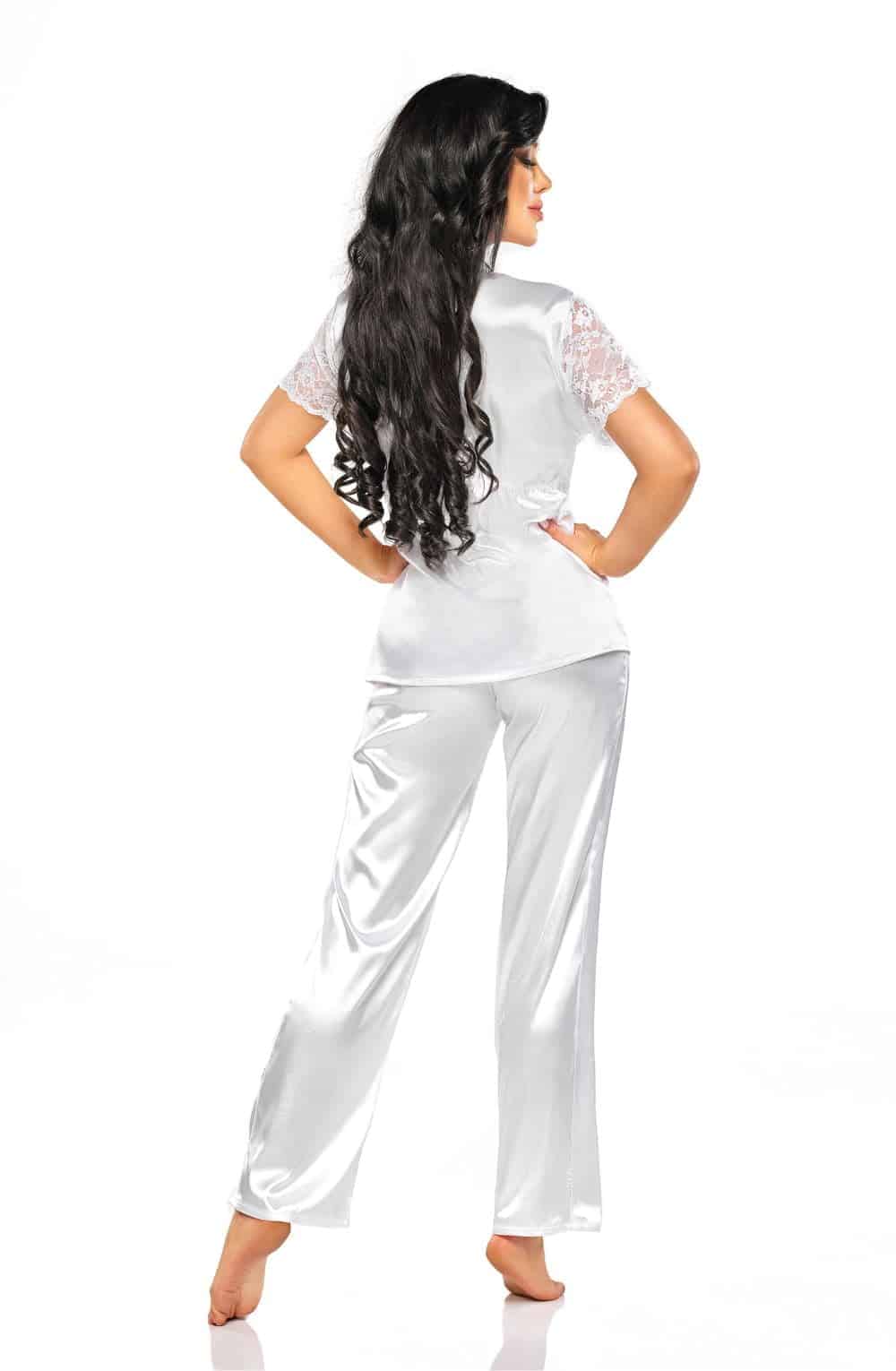 The Missy Set in white is a luxurious pyjama set that combines elegance and comfort, perfect for any woman. Here’s what makes this set special: Key Features The luxurious delicate, shiny fabric provides incredible comfort and a sophisticated look. Subtle lace details on the sleeves and waist add charm and sensuality. A deep V-neckline highlights the bust, enhancing femininity. The elastic waistband ensures a perfect fit and maximum comfort. Long, loose pants offer full freedom of movement and comfort throughout the night. The Missy Set in white makes an excellent gift, presented in elegant packaging with a product photo. Indulge in a touch of luxury with the Missy Set!