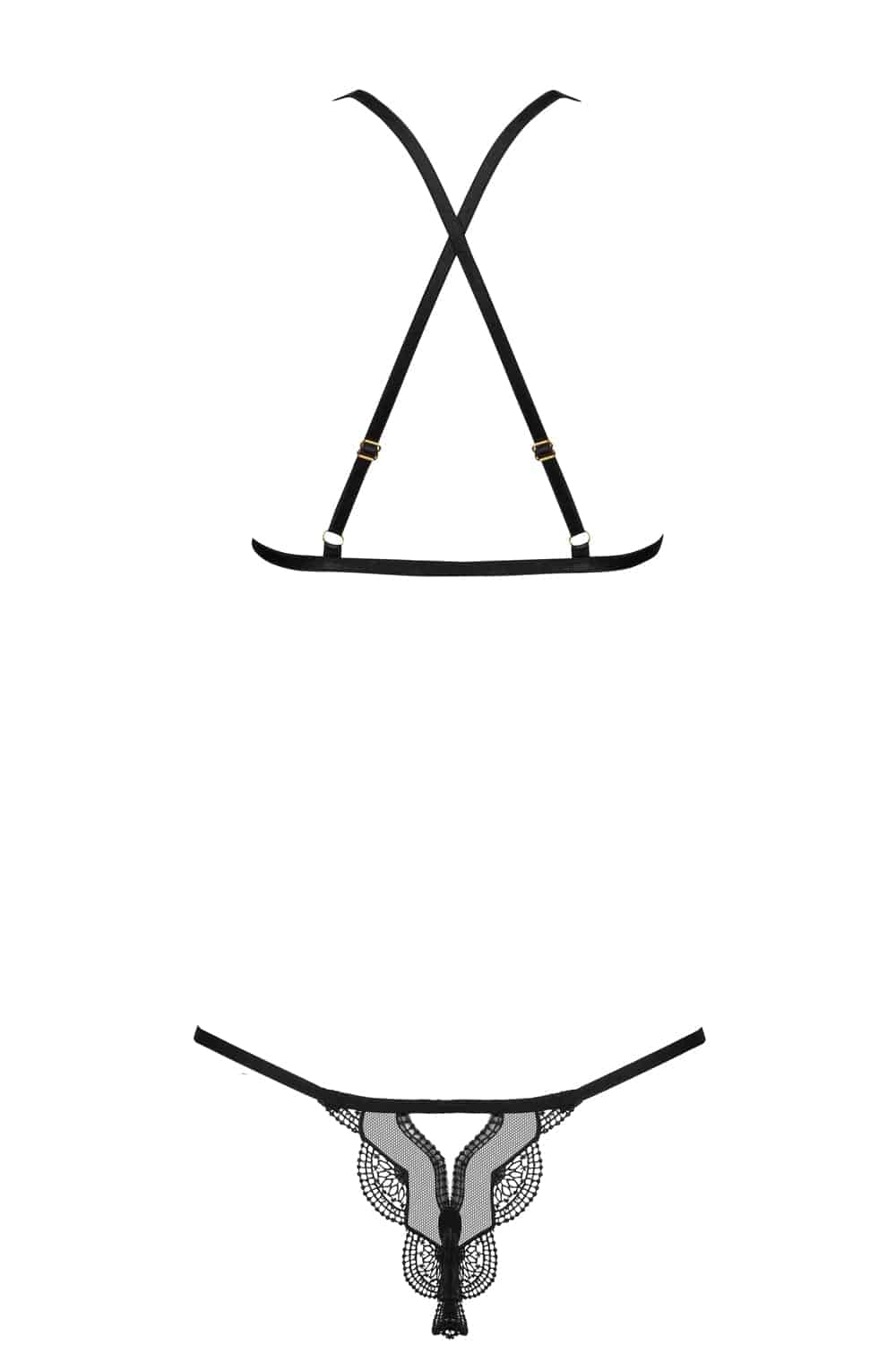 A very provocative three piece set that comprises an open cup underwired shelf bra, matching suspender belt and thong.  The black lace on Chiara is both stunning to look at with beautiful soft feel. (please note the nipple covers are not included – we have a range of nipple covers which are available separately). This item arrives packaged in a lovely Beauty Night box.