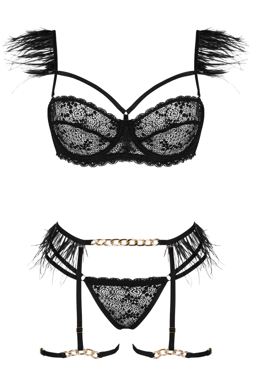 Discover a unique and captivating three-piece lingerie set designed to enchant. The set features an adjustable underwired bra adorned with feather effect shoulder strap detail, offering both support and a touch of glamour. The suspender belt is embellished with striking chain details and feather effect to match the bra, adding an edgy, sophisticated flair. Completing the look are leg straps with matching chain accents and a coordinating thong. This extraordinary set combines luxurious materials and bold design elements for a truly unforgettable set. Arrives packaged in a Beauty Night box.