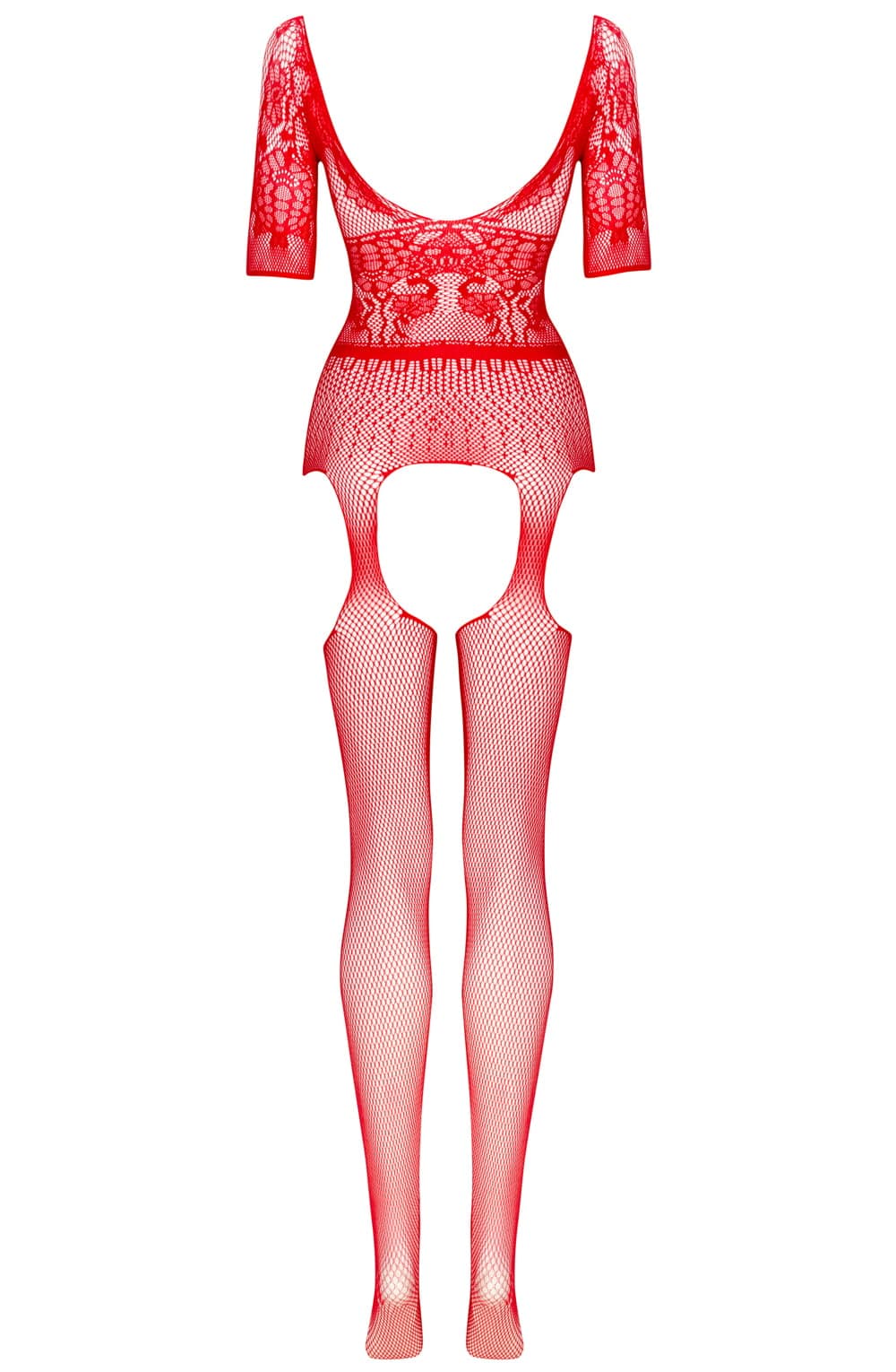 Discover the allure of our beautiful and sexy bodysuit, designed for comfort and provocation. A floral pattern graces a deep neckline, complemented by a fishnet with large eyelets running along the front. Long sleeves add class, and a practical crotch opening enhances functionality. Presented in elegant packaging with a captivating product photo, this bodysuit invites you to experience the perfect blend of comfort and allure.