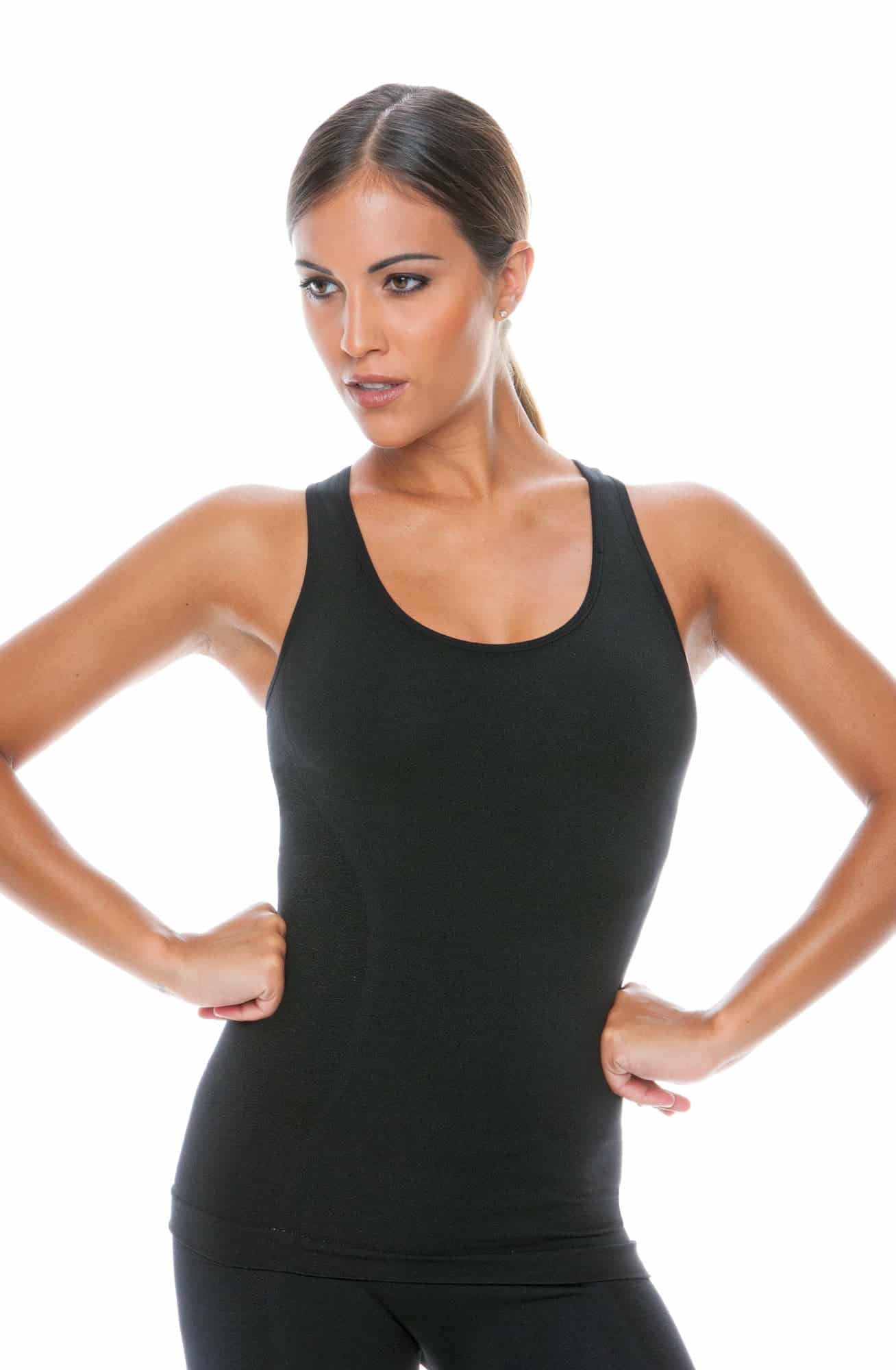 Sporty tank top with incorporated bra. Racer-style and wide strap feature. Made from breathable fabric keeps the skin cool and dry. Provides extra comfort and double support. Perfect fitting figure keeping and flat seams. Also available in Melange/Grey (212185). Item comes packaged in a Control Body box.