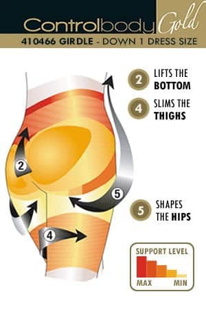 Shaping girdle with high compression providing a firm level of support. Soft microfiber and silicon on the waist. Jacquard panelled and scalloped edge. Shapes the waist lifts the bottom shapes the hips slims the thighs and smooth the tummy. Anti-bacterial gusset. Item comes packaged in a Control Body box.