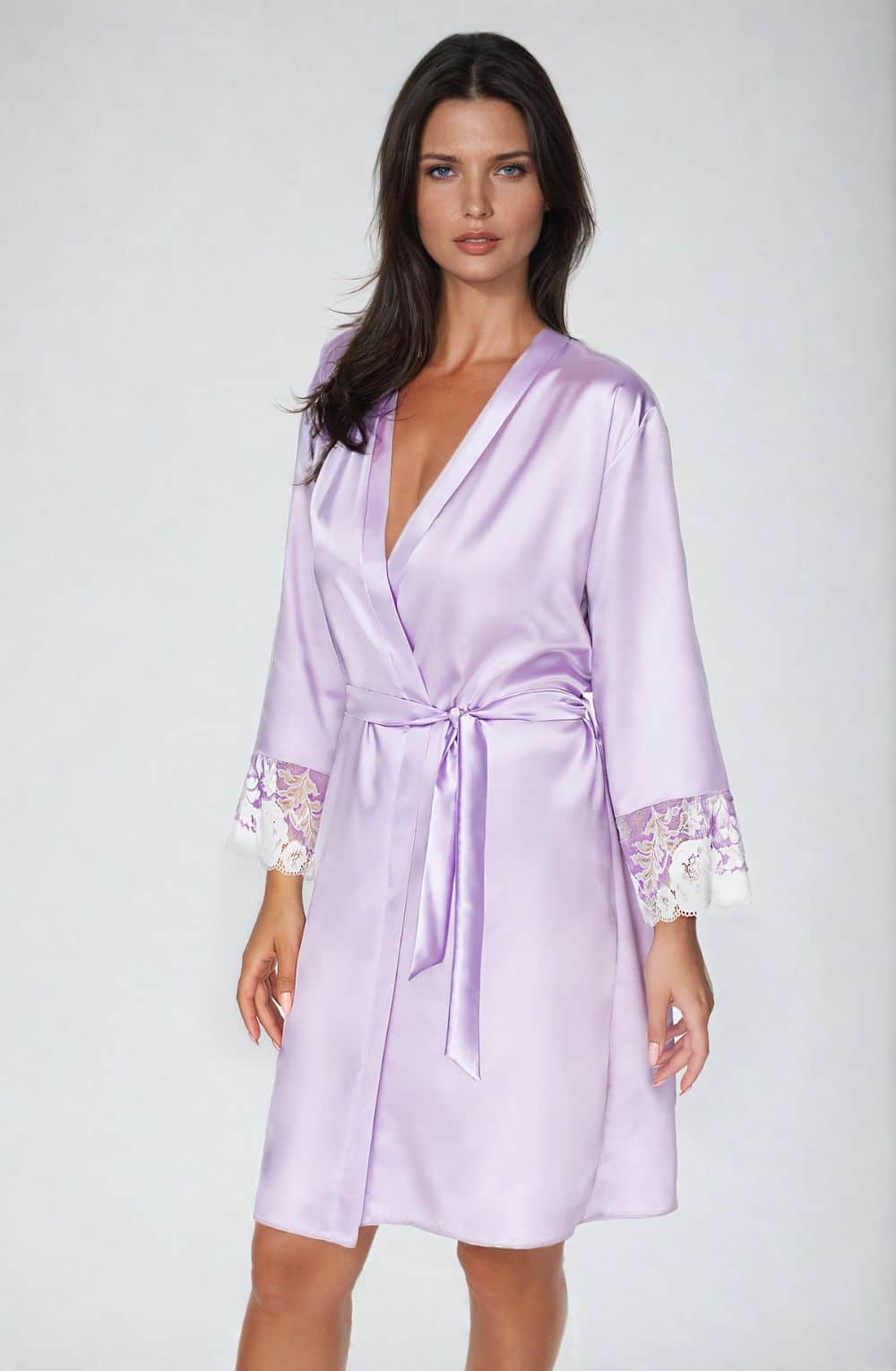 A sophisticated dressing gown made of delicate satin. The cuffs are finished with transparent chiffon and decorated with intriguing embroidery which is stunningly beautiful. The dressing gown has a black tie belt and is packaged in tissue paper and an elegant box. There is a matching nightdress available separately, please see related products.