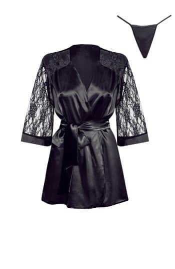 Discover the timeless elegance of the Beauty Night BN6657 Marissa Peignoir Black. This luxurious short dressing gown, made from premium black satin with wide 3/4 length lace sleeves, comes complete with a matching thong and satin belt—perfect for enhancing your seductive ensembles. Explore the full Beauty Night collection for complementary pieces.