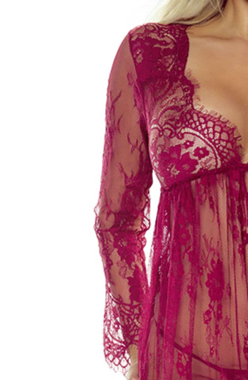Stunning super soft elegant full length lacey robe and matching thong. Shaped cups delicate hem and shoulder design make this an eye-catching number! Soft light and delicate this robe is sure to make the wearer feel very special! Arrives packaged in a lovely Provocative box.