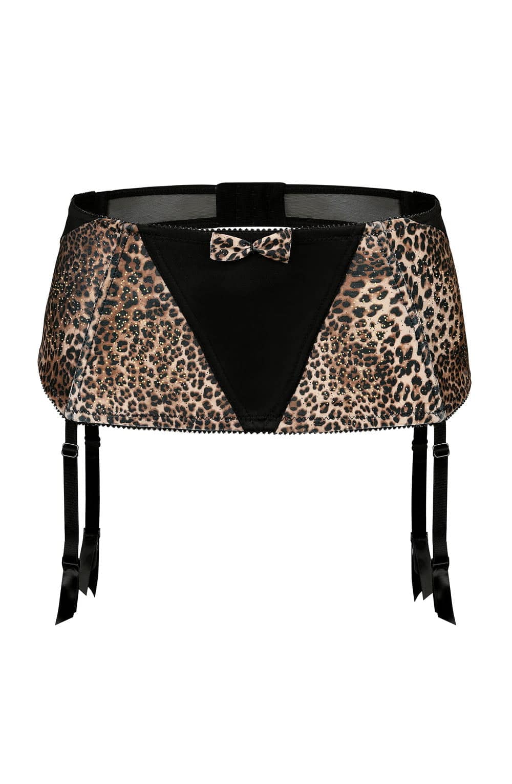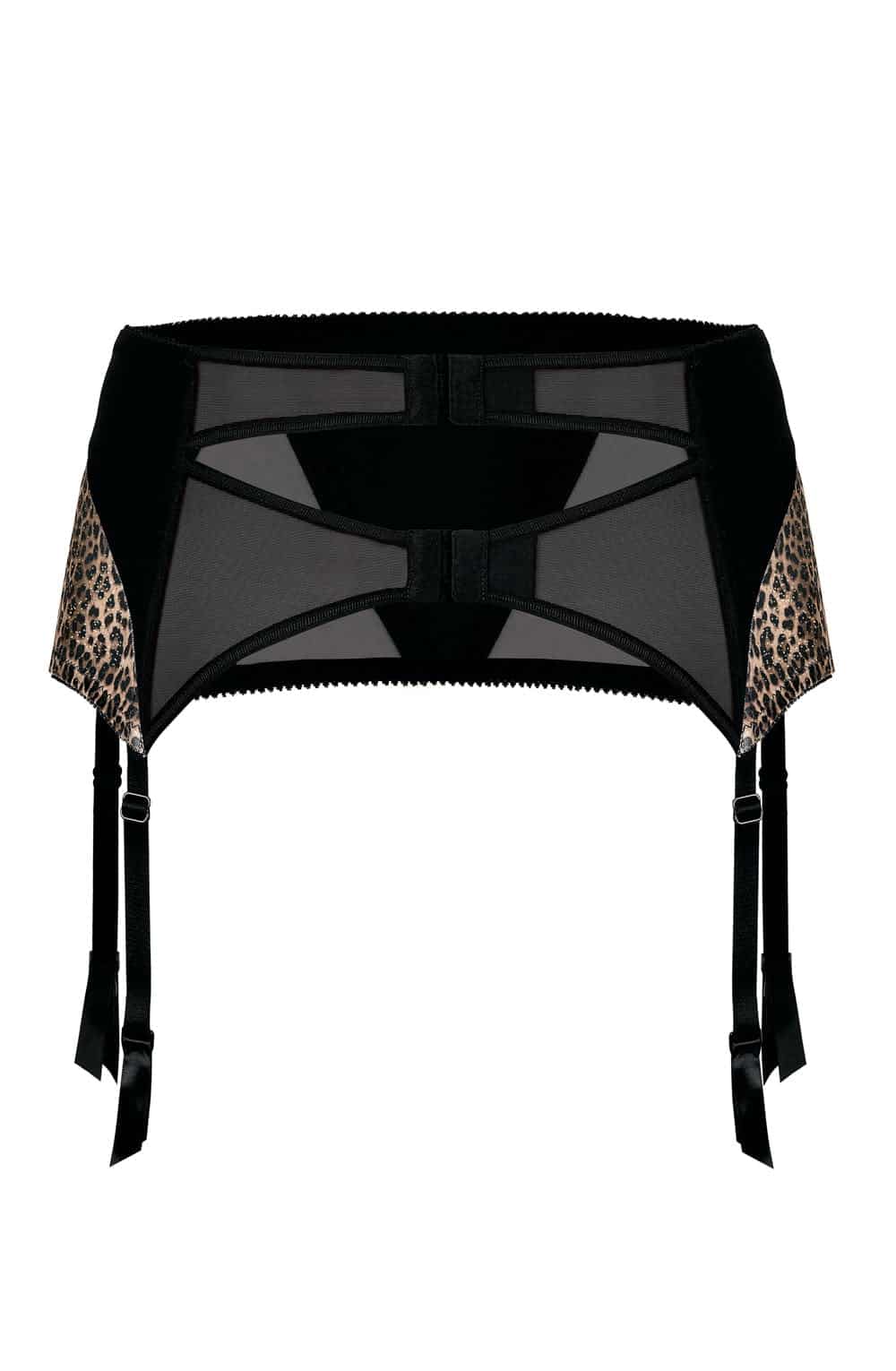 A gorgeous suspender belt that features a black v shape panel at the front and a subtle glitter finish over the leopard print detailing that will make sure you shine. The back of the suspender belt has cut out sheer black fabric detailing and two adjustable parallel hook and eye fastenings. The suspender straps are adjustable and finished with ribboning at the ends and metal rubber suspender clasps. Zoje arrives packaged in a lovely Roza box making it ideal as a gift or special treat. The Zoje collection comprises of a push up bra, soft cup bra, thong or brief and suspender belt. Each piece is sold separately to maximise the mix and match options. Please see the ‘Related Products’ tab below to see other combinations.