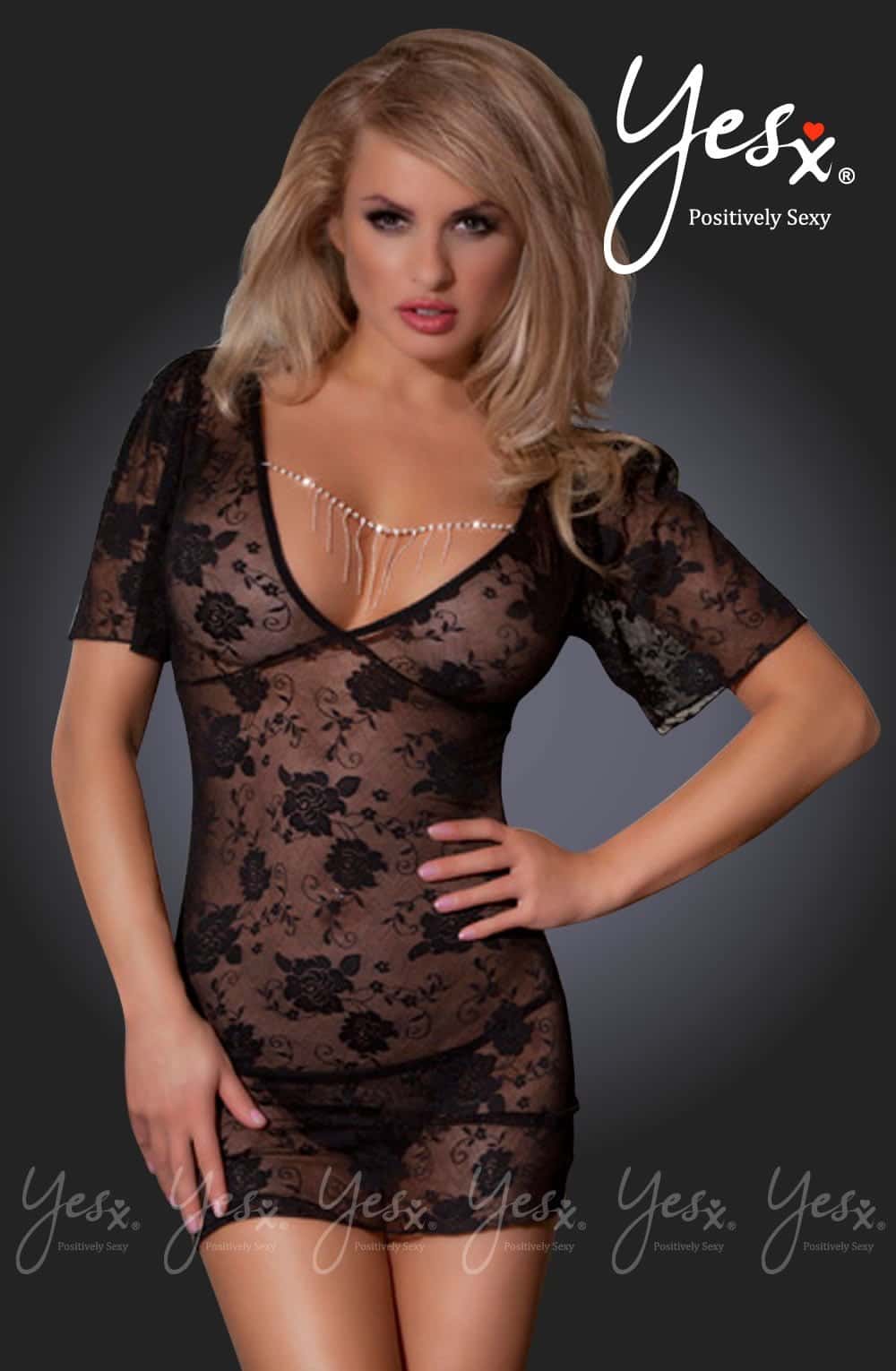This is ace! Black floral lace babydoll with a deep ‘V’ and faux diamonds decorations and matching thong.