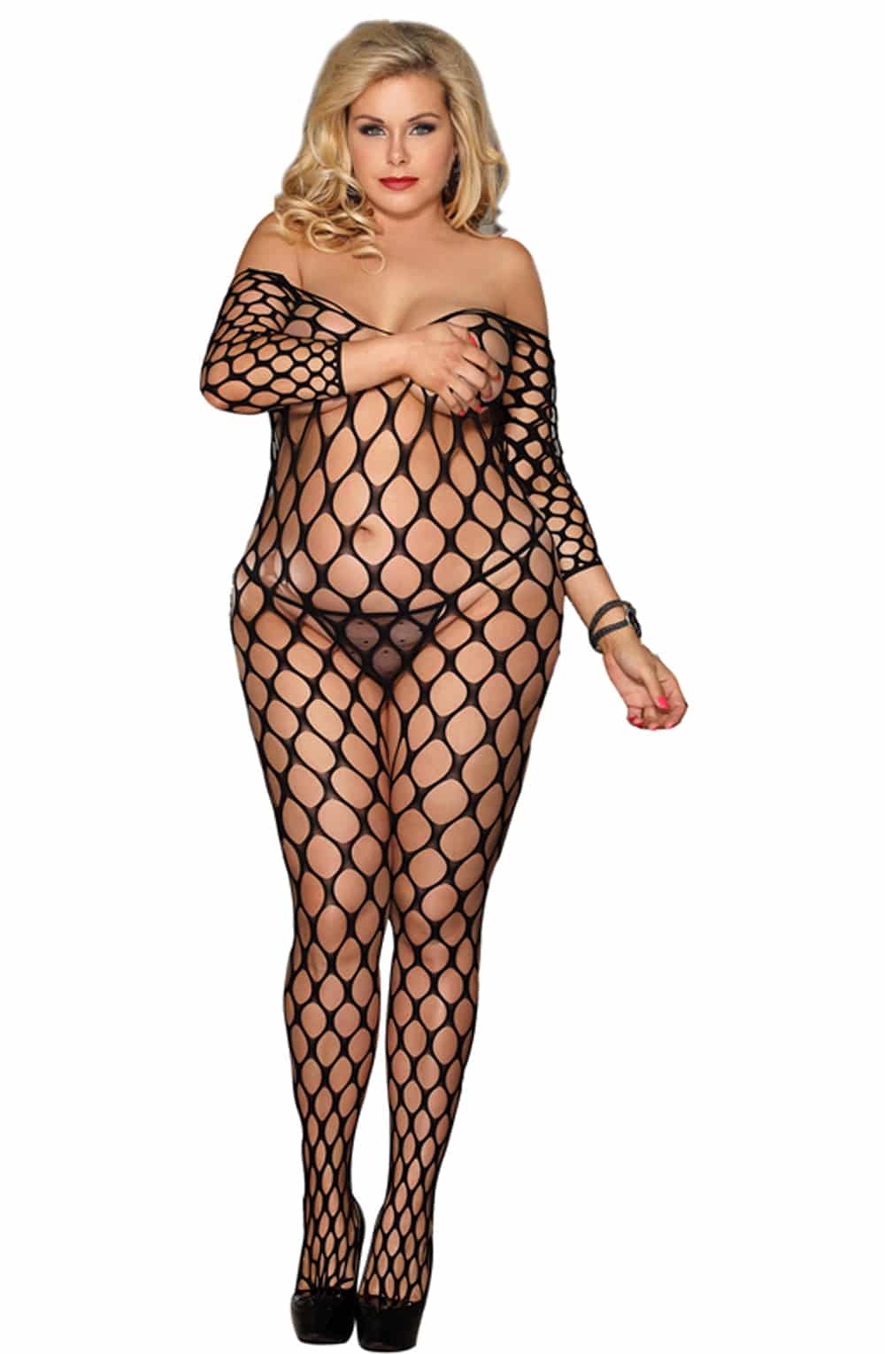 An all over holey design!  This plus size bodystocking has three quarter sleeves and arrives packaged in a box. Please note thong is not included.