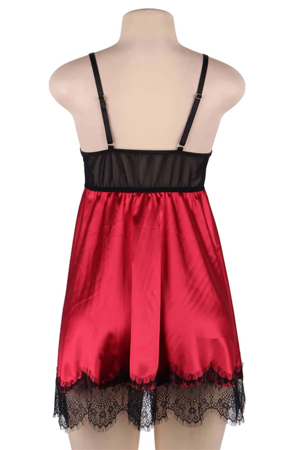 Beautiful flowing red satin babydoll with black lace cups.  The straps are adjustable and the hem is edged with deep eyelash lace. Matching lace blindfold is included. This item arrives packaged in a Yesx satin bag.