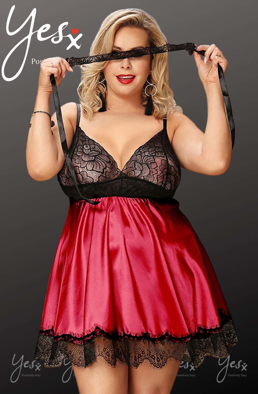 Beautiful flowing red satin babydoll with black lace cups.  The straps are adjustable and the hem is edged with deep eyelash lace. Matching lace blindfold is included. This item arrives packaged in a Yesx satin bag.