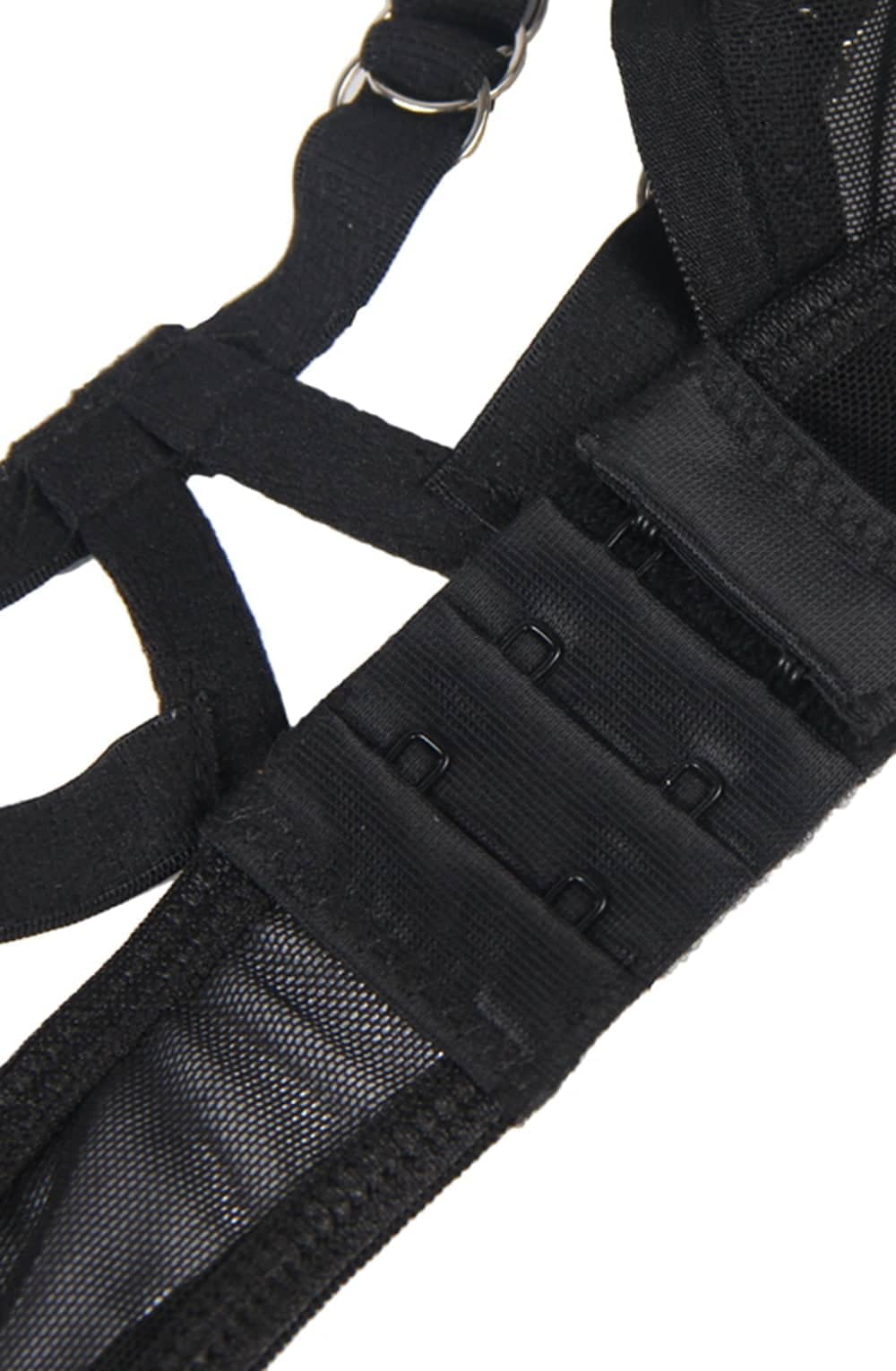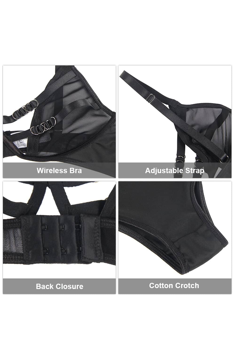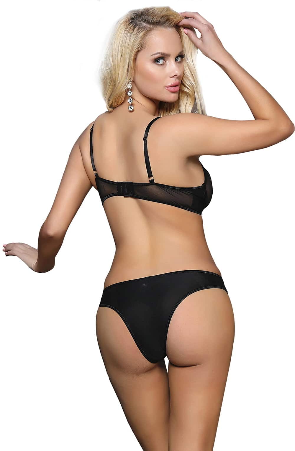 Black bra and brief set. The bra is decorated with a ring design and is not underwired. Fully adjustable for perfect fit. Item arrives packaged.