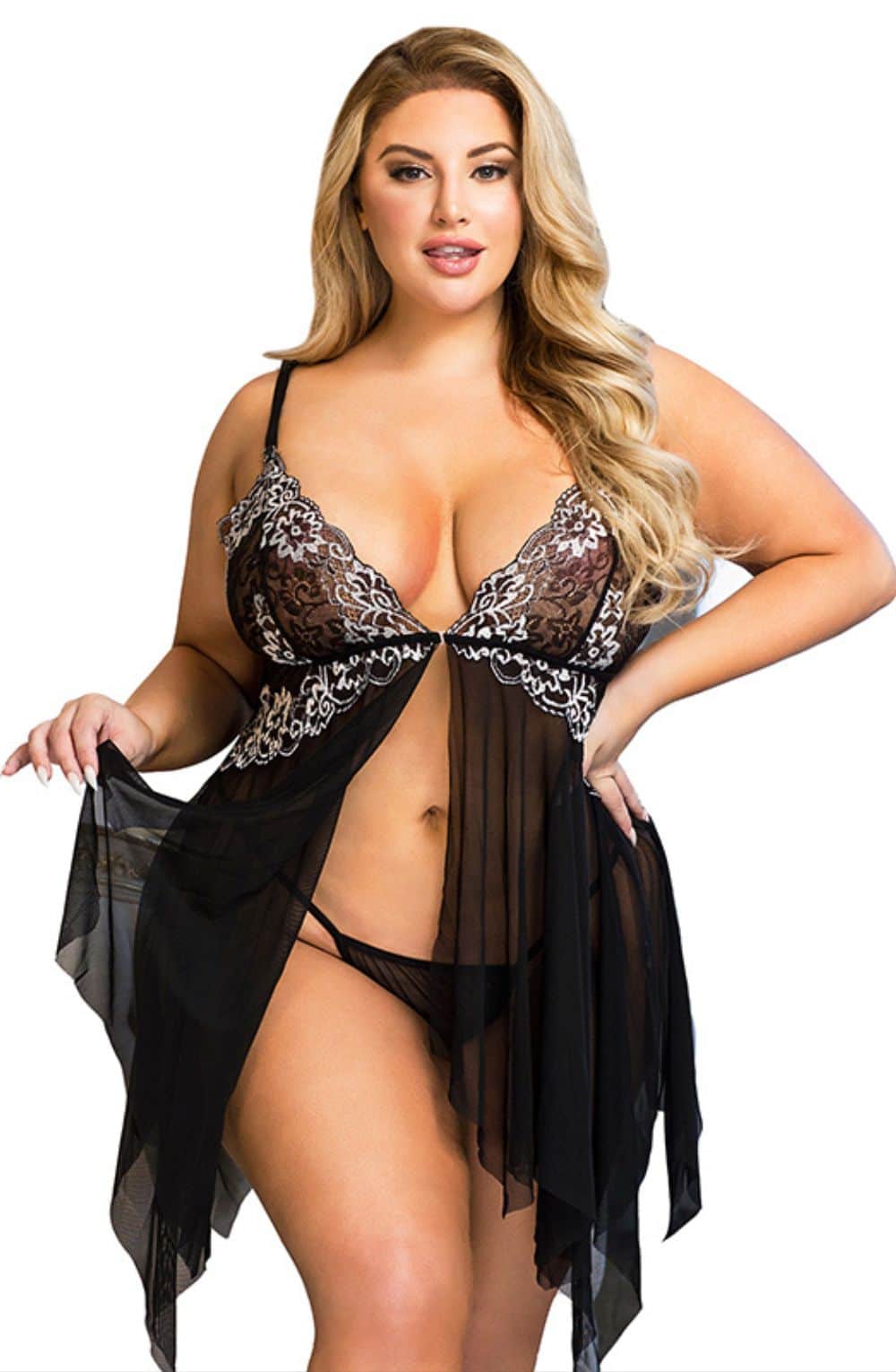 Beautiful floaty babydoll with adjustable shoulder straps and contrasting embroidery on the cups, front and back. Centre front fastening.  The item comes with a matching thong and arrives packaged.