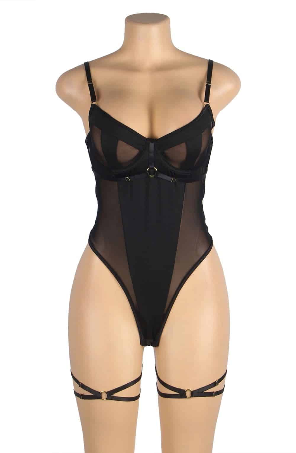 Elevate your lingerie collection with our Black One-piece Mesh Underwire Bodysuit, a perfect blend of sophistication and sensuality. Crafted from luxurious and breathable mesh fabric, the underwire cups provide subtle lift and support, enhancing your natural curves. The sleek one-piece design creates a flattering silhouette, while the added intrigue of matching leg rings brings a touch of playfulness. Whether you’re surprising someone special or treating yourself, indulge in the luxurious comfort and captivating allure of this exquisite lingerie piece that effortlessly combines elegance and allure. Underwired Matching leg rings included Adjustable Hook and Eye bra fastenings Adjustable bra staps Popper fastening at the crotch