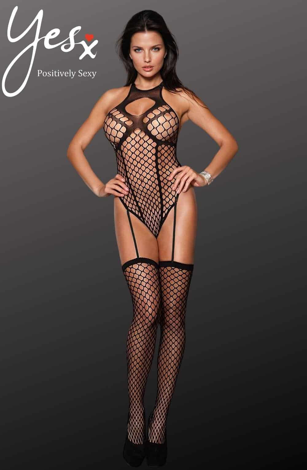 Turn up the heat with this fierce and flirty fishnet bodystocking! Designed to make a bold statement, this one-piece outfit combines a halter-style top with open-knit fishnet that hugs every curve for a seductive, head-turning look. The large diamond pattern adds a daring edge, while the attached garter straps and thigh-high stockings create a seamless, all-in-one lingerie set. Perfect for a night out, a special surprise, or a confidence-boosting piece just for you, this bodystocking is made to make you feel unstoppable. Slip into this sultry design and let your inner goddess shine!