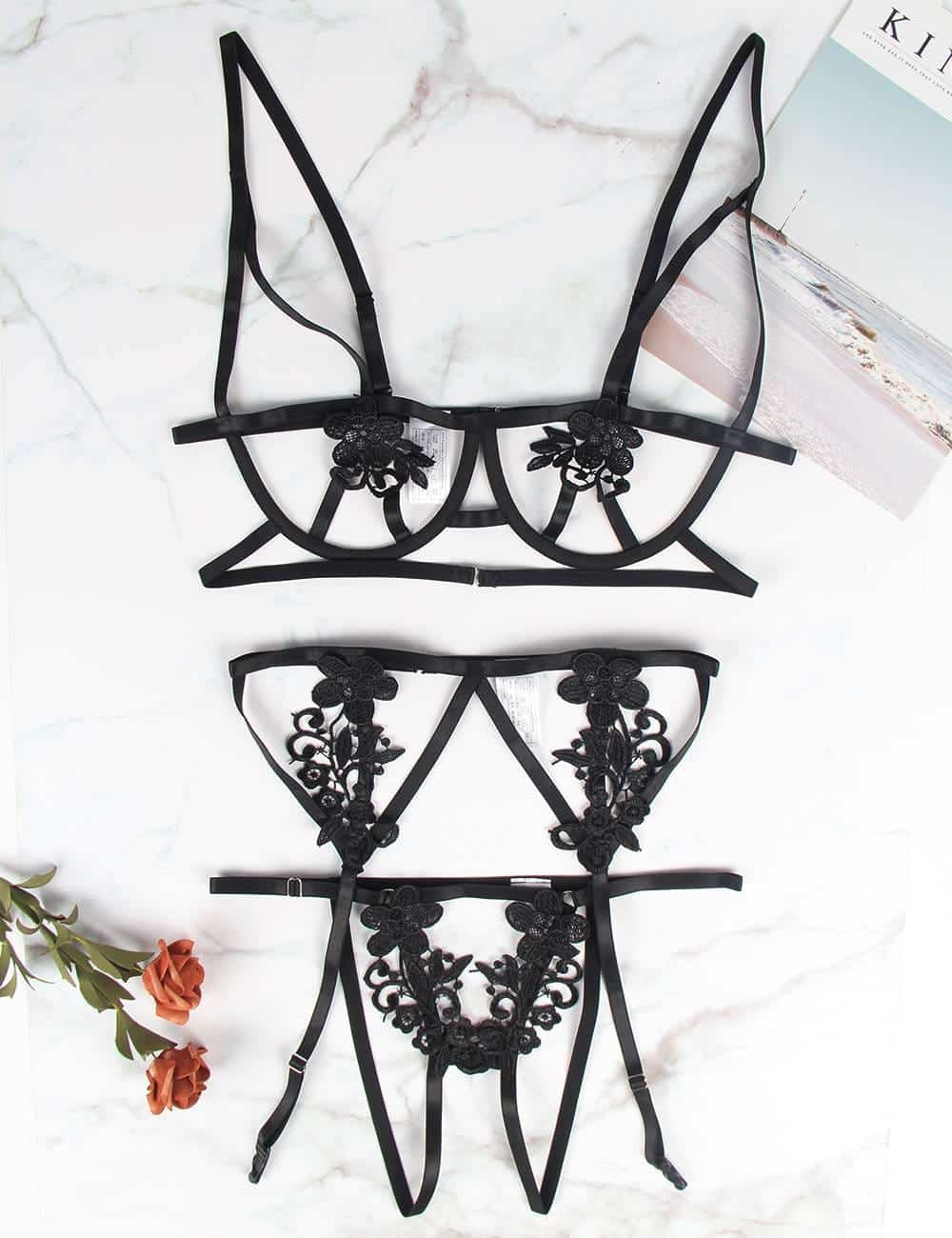 Get ready to turn heads with this ultra sexy 3 piece black lingerie set! Featuring a sultry bra with underwire for added support, this set is all about elegance and allure. The delicate embroidery applique details add a touch of sophistication, perfectly complementing the daring cut-outs and strappy design. Paired with a matching thong and a seductive garter belt, this set is designed to make you feel bold and beautiful. Ideal for special nights or simply indulging in a confidence boost, this black lingerie set is your go to for unforgettable moments.