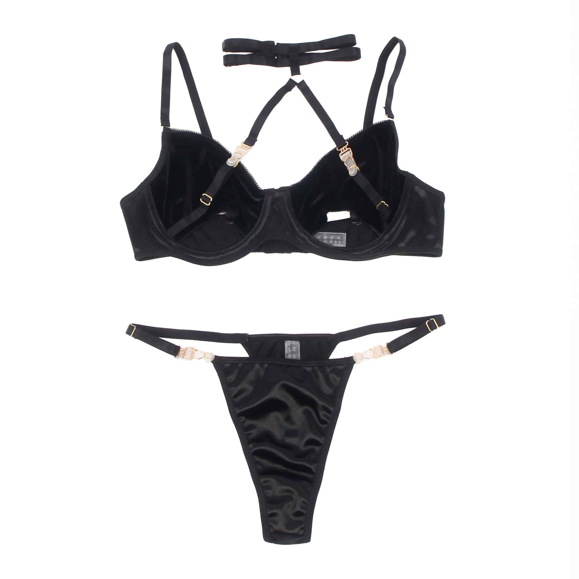 Indulge in bold elegance with this luxurious black bra and thong set, featuring a soft, velvety feel that adds a touch of sophistication. The structured bra is designed with daring cut-outs, adding a hint of intrigue, while delicate gold hardware details bring a glamorous finish. Complete with a halter-style choker neckline and adjustable straps, this set offers a customised fit that perfectly highlights your curves. The matching high-cut thong is finished with gold accents for a polished look. Ideal for those moments when you want to feel both seductive and effortlessly stylish!