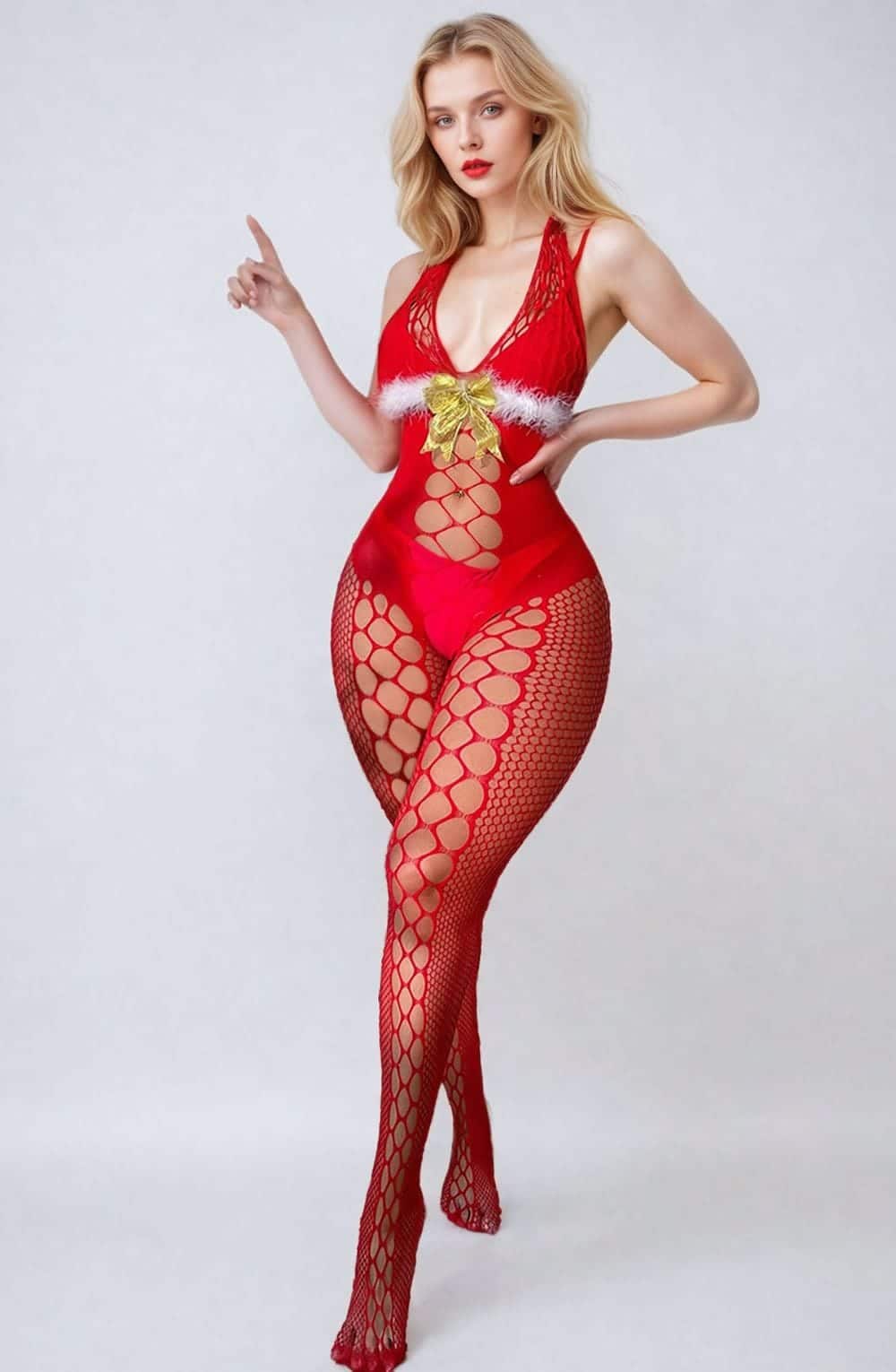 Unwrap the magic of the season in this seductive red halter neck bodystocking! With a daring design featuring sheer lace and a figure-hugging fit, this piece is trimmed in fluffy white for that iconic holiday touch. A dainty gold bow adds just a hint of sparkle, making it a perfect choice for festive fun. Please note: the model’s lingerie (bra and thong) is not included, allowing you to style it with your own favourite pieces underneath. Ideal for cosy evenings in or creating a holiday surprise, this bodystocking will make your nights merry and bright!