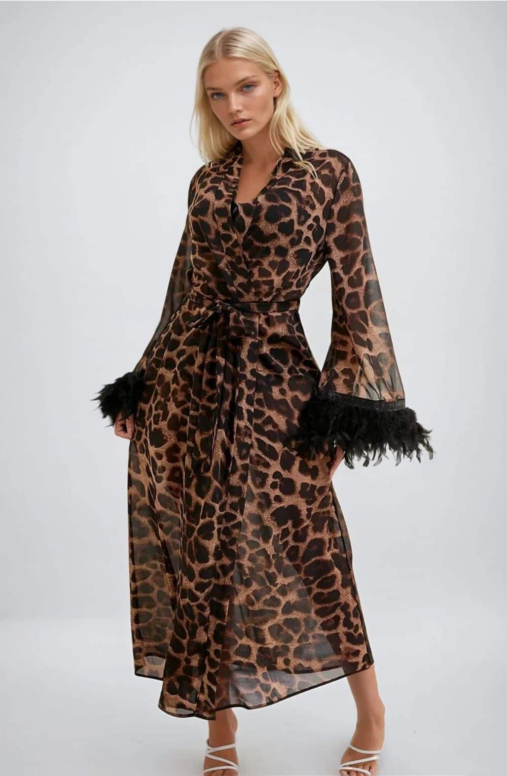 The YesX YX880 Leopard Print Robe combines sheer allure, feather-trim sleeves & a fierce animal print for head-turning glamour. European craftsmanship meets bold sophistication.