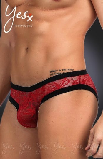 Seductive red sheer floral lace YesX YX976 Men’s Boxer Brief with black satin like finish waist band. Featuring decorative criss-cross tie detailing at the back of the briefs.