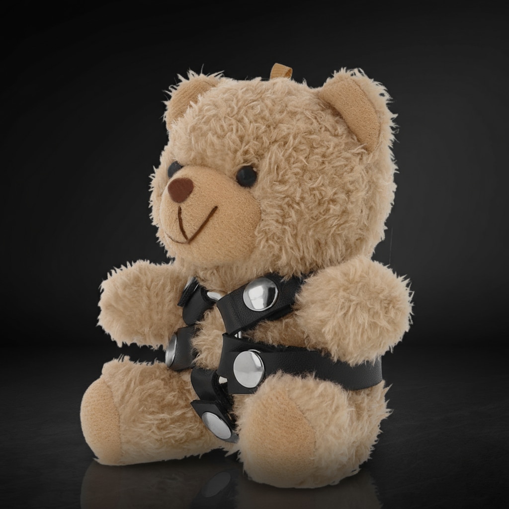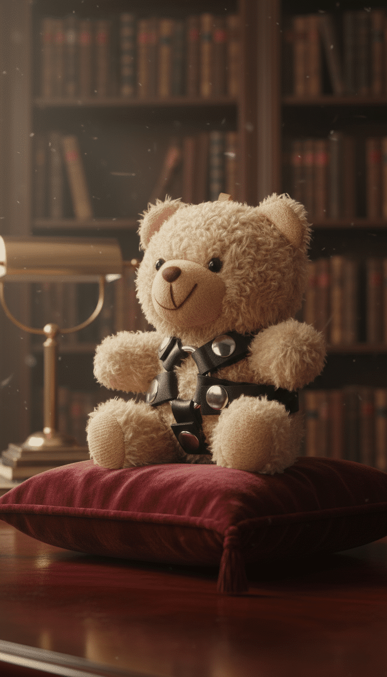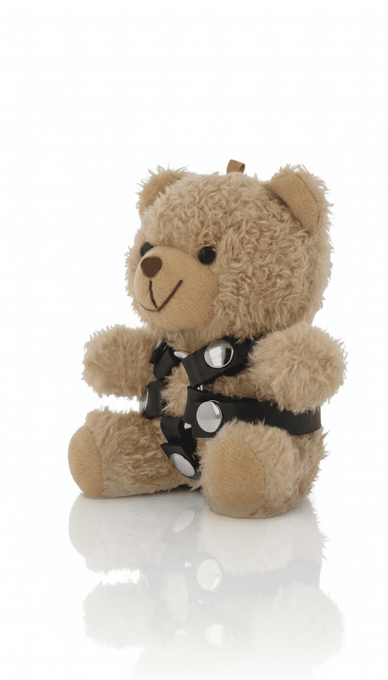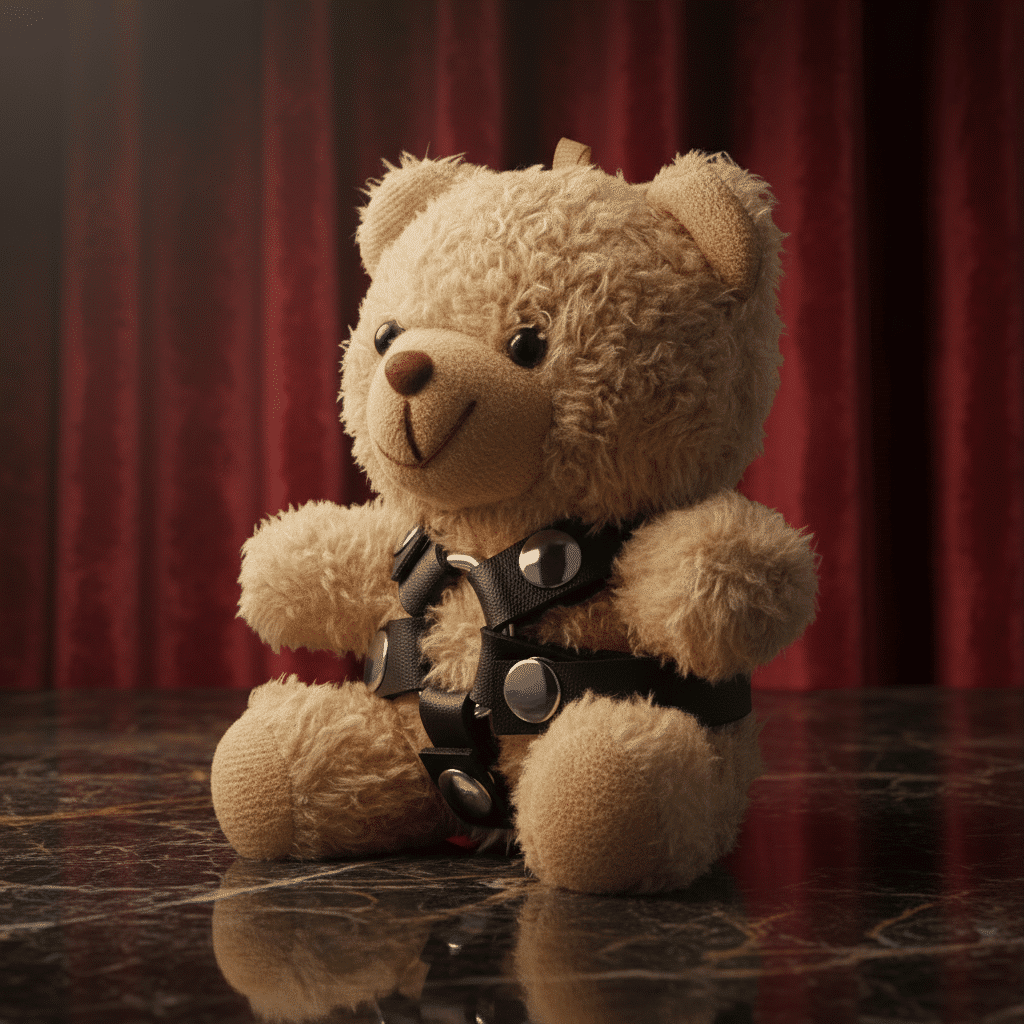 Yogi wears a close-fitting leather & lace harness, soft yet firm, that traces over his chest and shoulders. A half-mask conceals one side of his face, lending mystery; the mask’s edges meet the fur with careful stitching that hides its seams. His wrist is cuffed with a metallic handcuff linked by a short chain—a symbol of restraint, loyalty, and the unspoken bond between Yogi and those who trust him. Chains reach softly across his plush body, a subtle texture in contrast with fur’s smoothing.