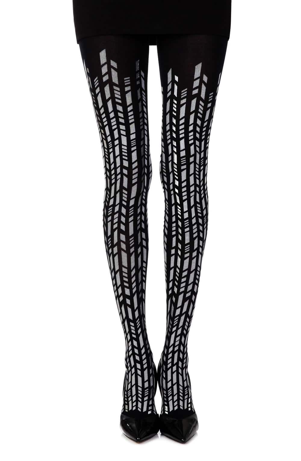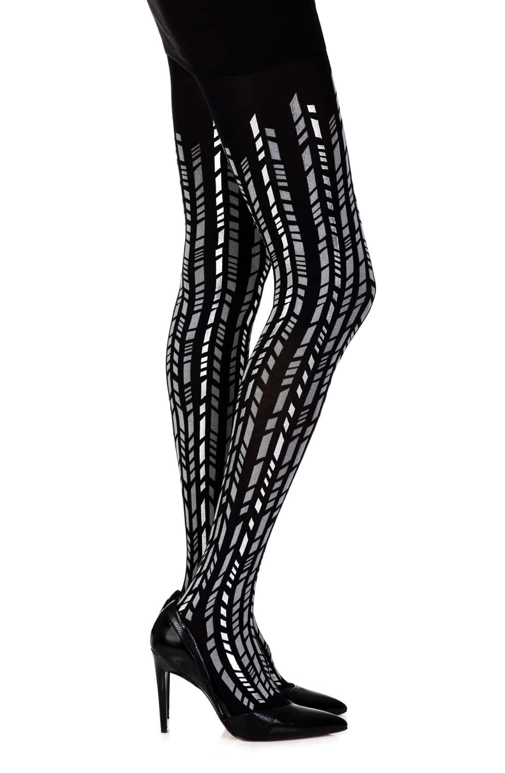 Zohara “Cross It” tights feature sleek silver and grey geometric prints on opaque black 100-denier fabric. Modern architectural legwear made sustainably in Europe.