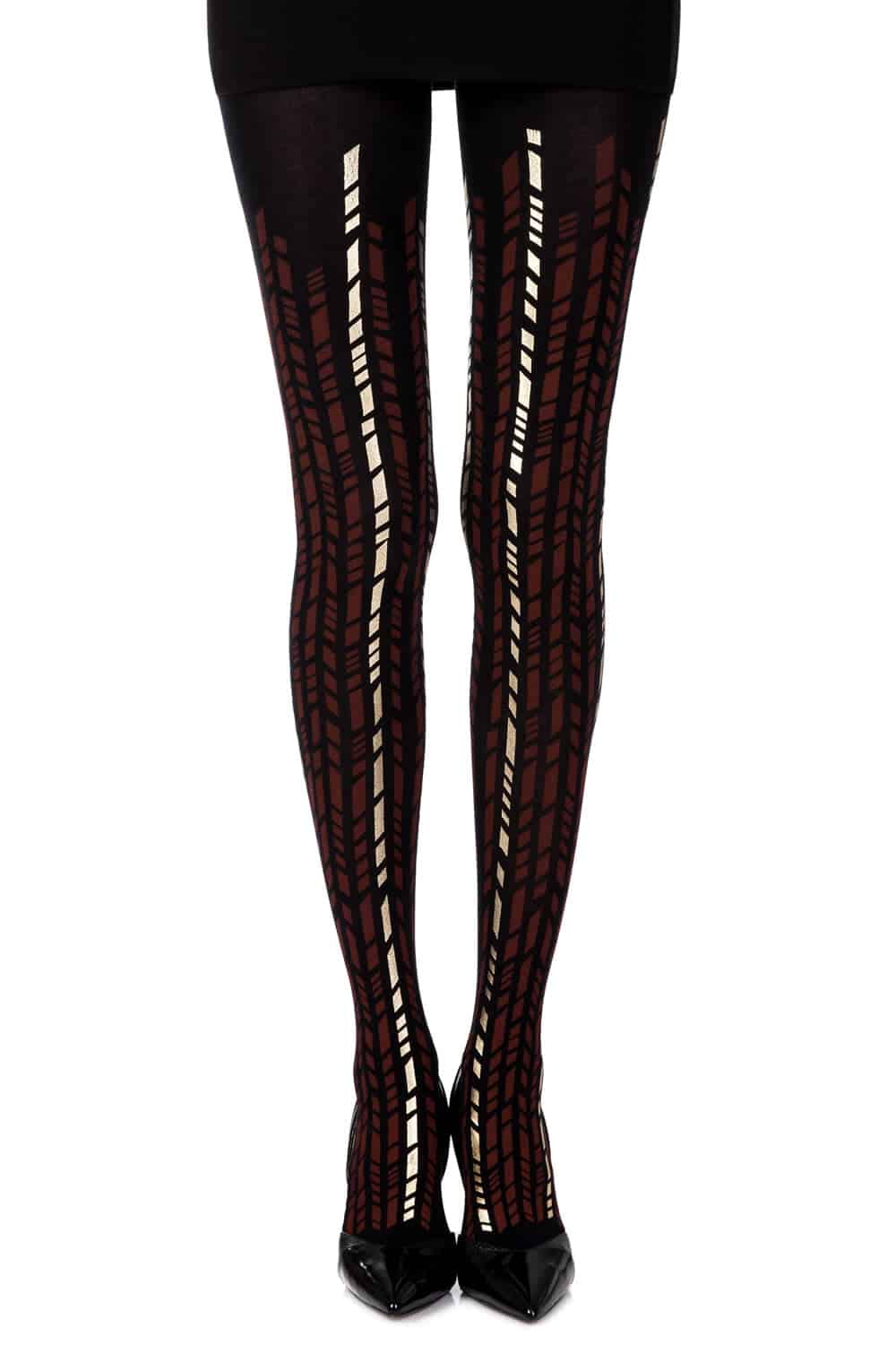 Zohara “Cross It” tights feature luxe burgundy and gold geometric prints on opaque black 100-denier fabric. Sophisticated statement legwear made sustainably in Europe.