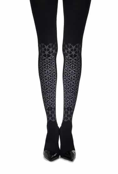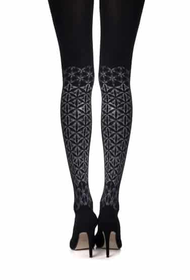 Turn your legs into wearable art with Zohara’s “Frozen Shapes” tights. These opaque 120-denier black tights showcase a modern grey abstract print that creates striking contemporary patterns across both legs, front and back.