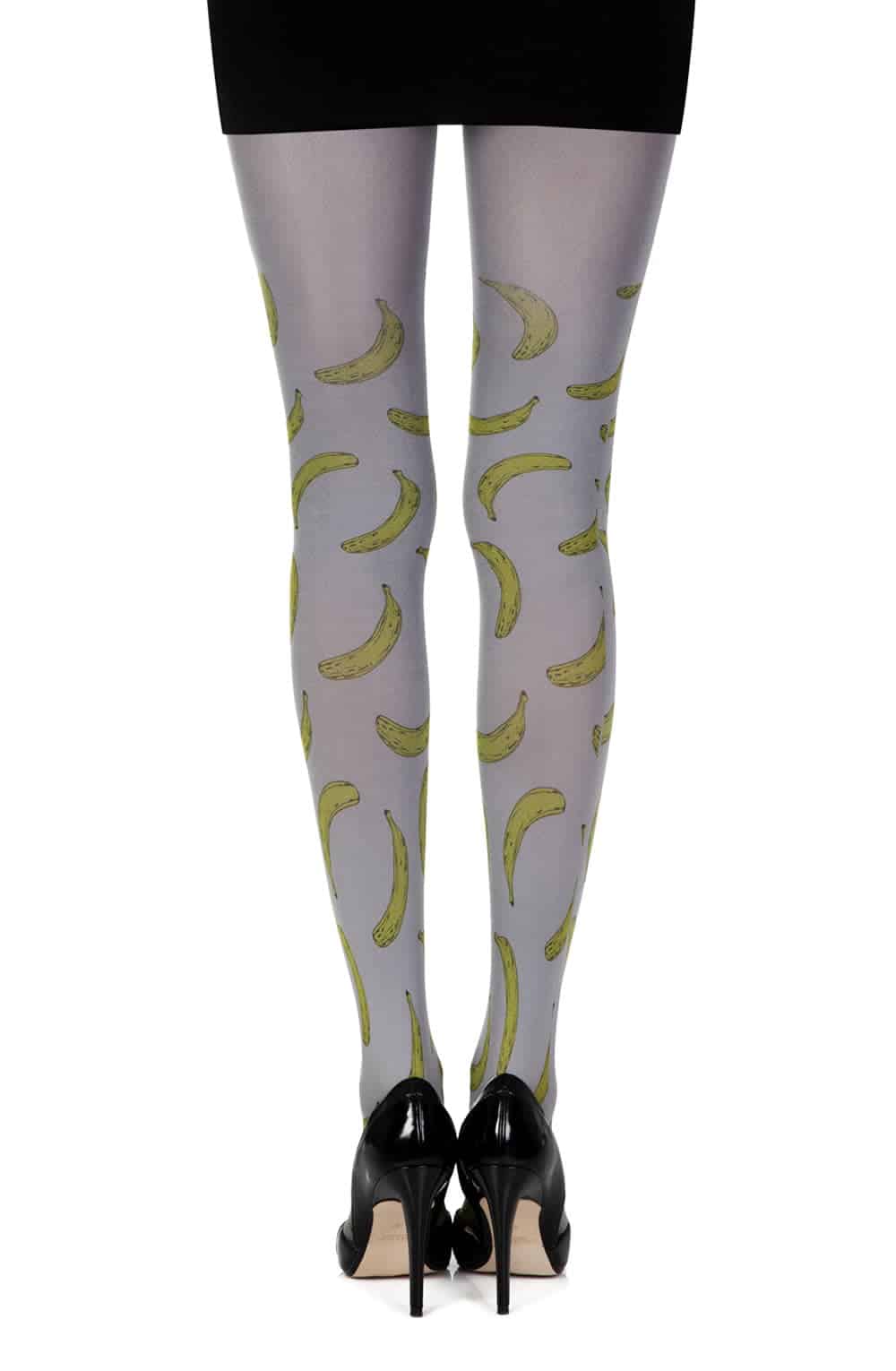 Zohara “Going Bananas” tights feature a playful tropical banana print on medium grey 120-denier fabric. Whimsical yet wearable legwear made sustainably in Europe.