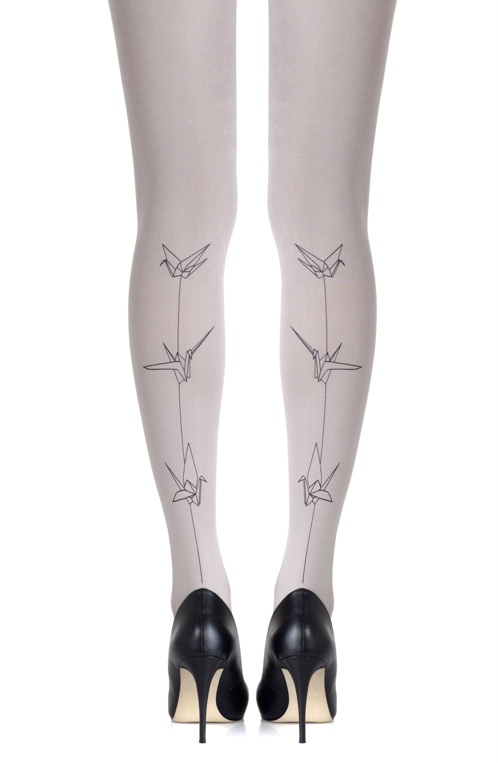 Fly high. The Paper Planes tights feature reversible origami-inspired bird graphics. You won’t want to take these off. Colour: Light Grey tights with Black print. Thickness: 120 denier. Unless they have X-ray vision no one will be able to see through these opaque tights. Is the party in the front or the back? You choose with reversible tights where to place all the fun. Hand print no two are the same.